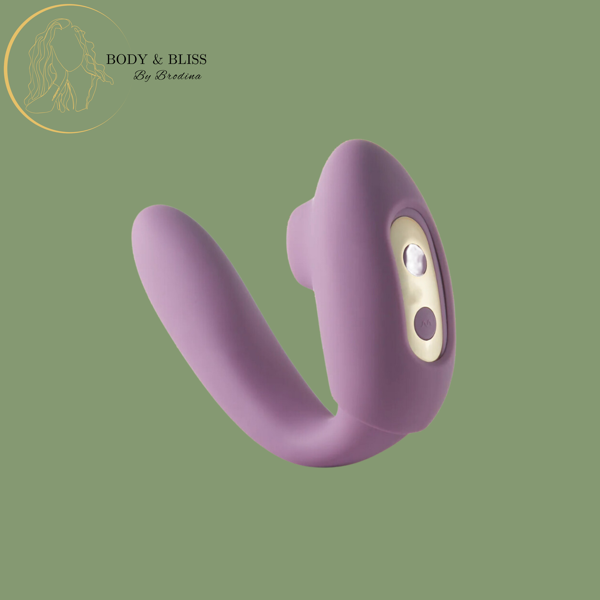 Luxe accents, air pressure, and G-spot stimulation come together in a feast for the senses. Let the insertable end tantalize with your choice of vibration speeds and patterns as the massager curves to nestle against your favorite pleasure point. Leave the sleeve on to surround your clitoris with gasp-worthy air pressure or remove it for thumping, pulsing clitoral stimulation. Which will you love more?