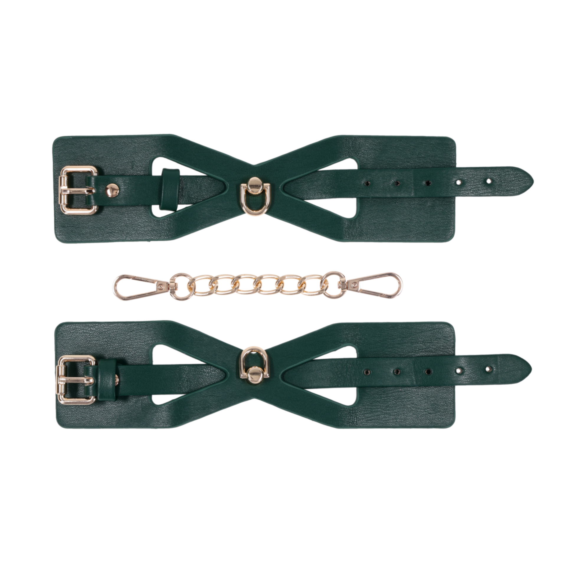 Get wrapped up in something irresistible. These emerald green cuffs feature dramatic cutout detailing to reveal more skin and spark more intrigue. Lined for softness and designed for visual seduction, they’re as comfortable as they are commanding. Use them to bind wrists together or attach to other Indica items for a coordinated scene. The gold chain and hardware add just the right touch of luxury to every surrender.